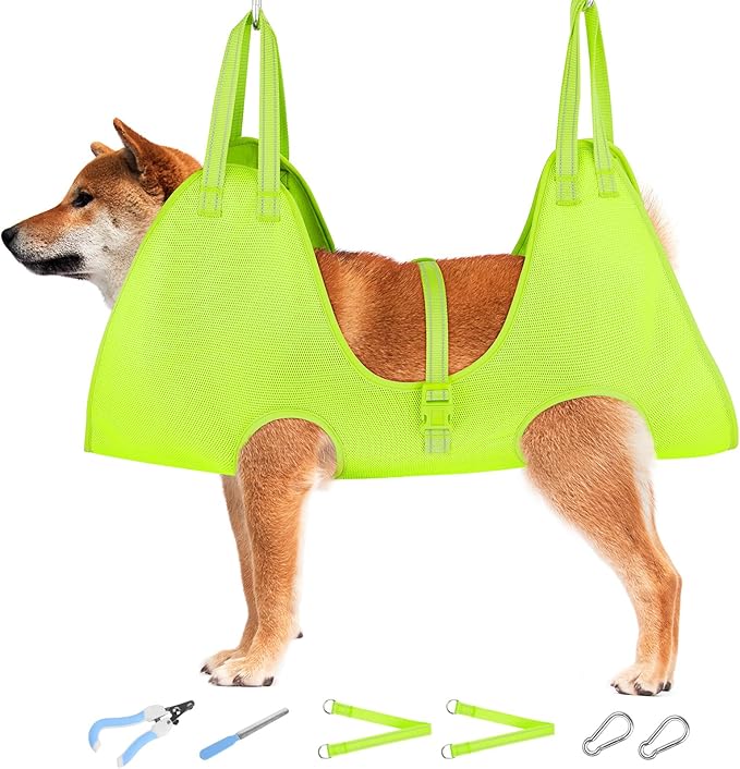 - 🐕HOME PET GROOMING KIT - this pet grooming supplies includes a dog grooming hammock, dog nail clippers, pet nail file, 2 sturdy straps, and 2 sturdy large carabiners, allowing you to easily groom your pet at home.