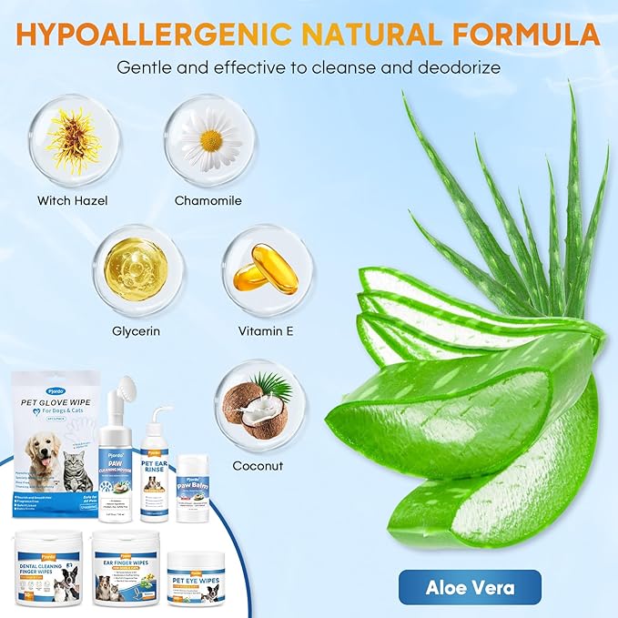 - Pet Cleaning and Care Kit Includes: 50pcs Teeth Cleaning Finger Wipes, 50pcs Ear Cleaning Finger Wipes, 100pcs Pet Eye Wipes, 6pcs Pet Grooming Glove Wipes, 4.06fl.oz Pet Ear Rinse, 5.07fl.oz Pet Paw Cleaner, 1.41oz Paw Balm, 1pcs Soft Silicone Grooming Brush. Effectively and quickly cleans all parts of your pet's body, ensuring your pet is clean and fresh.