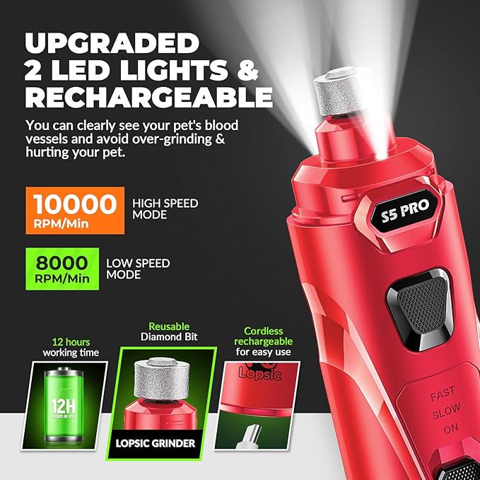 - 【Improved Precision: 2 LED Lights & Adjustable Speeds】: LOPSIC dog nail grinder for dogs features 2 LED lights that offer clear visibility of the quick, ensuring precise and safe nail trimming for your pets. The adjustable speeds(8,000 RPM to 10,000 RPM) of dog nail trimmers can adapt to small, medium and large pets nail trimming needs. When using the dog nail trimmers at the proper speed, pet nails of different hardness can be efficiently ground.