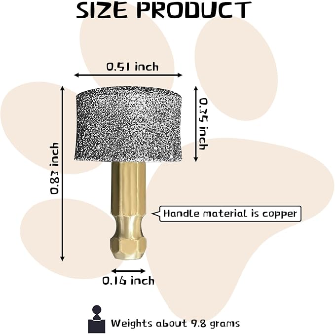 - 【Size】Featuring a 1/6 inch (4mm) copper hexagonal shaft handle, with a nail grinding head diameter of 0.51 inch and thickness of 0.59 inch, made with 80-grit diamond coating. Specifically designed for dog nail grooming.