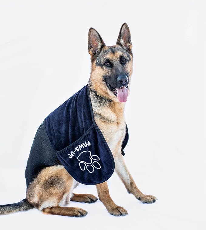 - Another benefit is the super absorbent material easily dries your pets coat and paws after a bath or coming in from the elements. The two-pocket design is also beneficial when lathering and washing your pet thus giving you control over the process. Whether cleaning paws, bathing or drying your pet the multi-functional Paws Up towel is your solution.