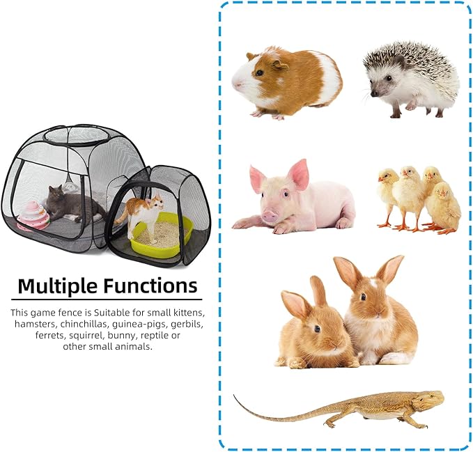 - Top & Bottom Zippered Design: The top zipper allows you to easily place fresh water, or toys. It provides easy access. You was able to keep him safely contained when you wasn’t able to monitor him. Bottom zipper you can remove it for washing, if necessary. It's also nice for outdoor use if you wanted to place the enclosure on your lawn.