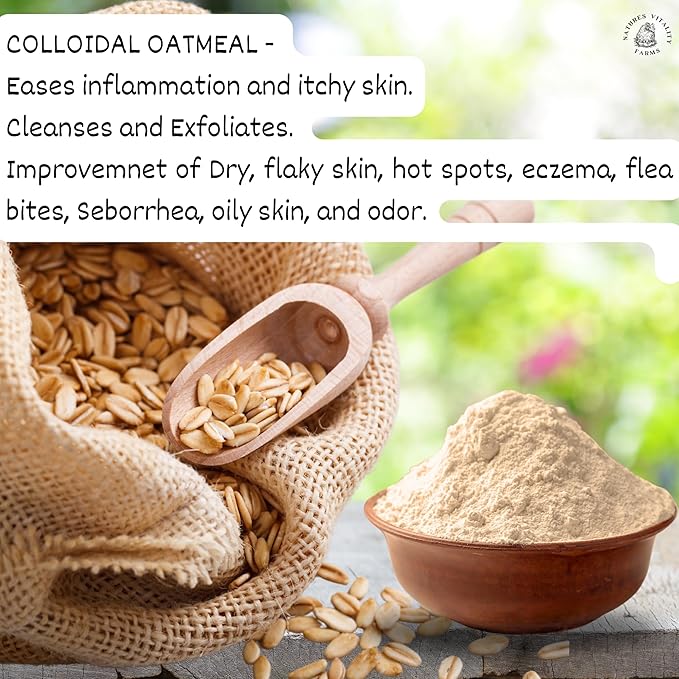 - Colloidal Oatmeal - Cleanses and exfoliates, helps with itchy and dry flaky skin.