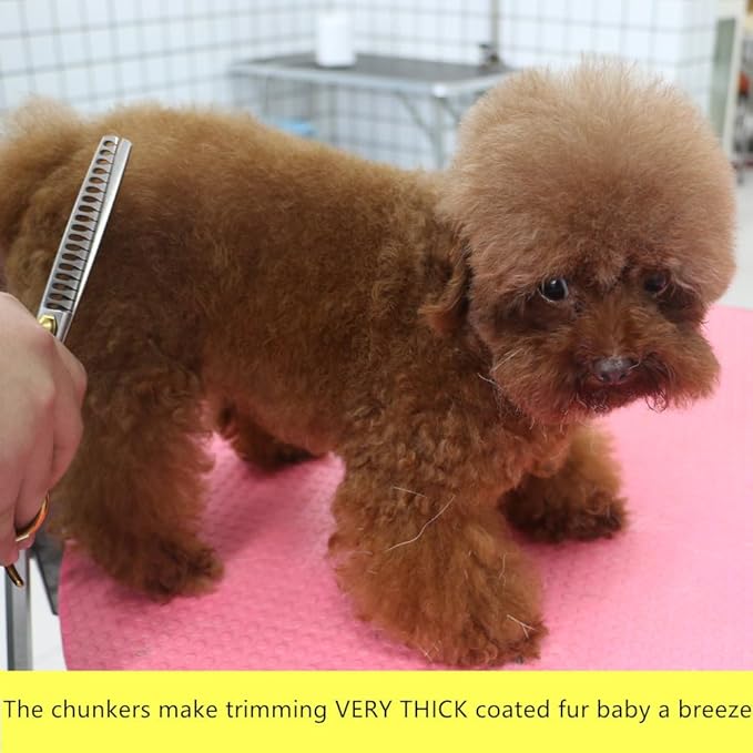 - 【70% Thinning Rate】-- 7.0 inch with 18 teeth allows for efficient removal of excess hair, thinning rate up to 70%, If the dog’s coat has gotten very shaggy and thick,the chunkers will help you cut through his fur easily, making it a breeze to use,so these scissors are perfect for professional groomers or home use.