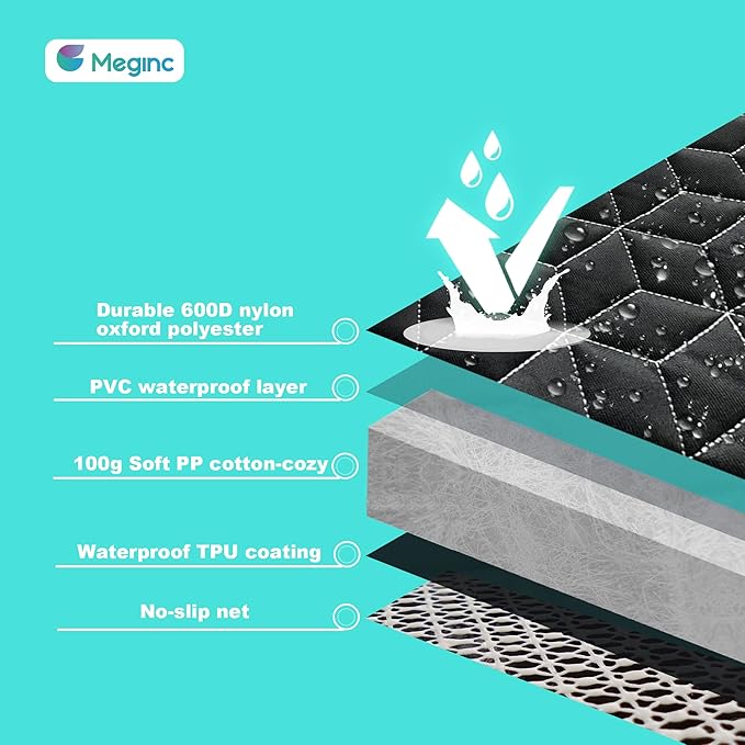 - Sturdy Material : HEAVYDUTY! HEAVYDUTY! HEAVYDUTY!Meginc dog back seat cover is made of 600D Oxford cloth, 100g soft PP cotton, 210D polyester fabric, 100% waterproof TPU and PVC anti-slip mesh. A thick pet seat cover can mitigate the damage of your vehicle and protect carpet, upholstery from unpleasantries such as dog hair, urine, or vomit, moreover our protectors also providing a familiar, comfortable and safety space for your pets during the road travel