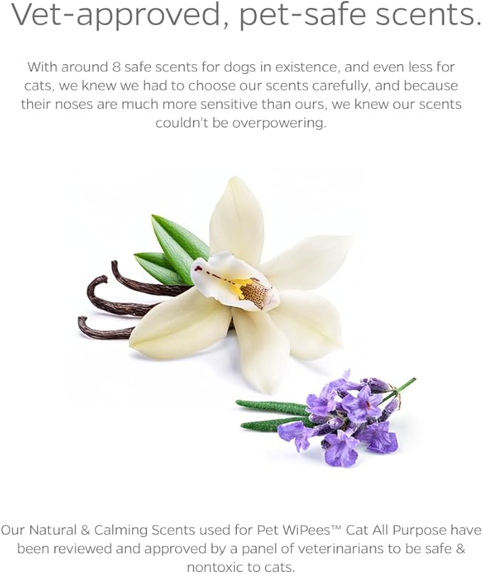 - VET-APPROVED, PET-SAFE SCENTS: When there are only 8 scents in the world that are safe for dogs, and even less for cats, we knew we had to have the safest scents that furbabies wouldn't turn their nose up at. Our scents have been reviewed and approved by a panel of veterinarians to be safe, nontoxic, and non-irritating for both dogs and cats. Just enough in our formulas to smell good, the scents in these cat pet wipes are not enough to upset sensitive sniffers.