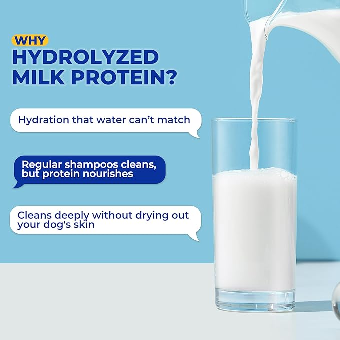 - PREMIUM NATURAL INGREDIENTS: Infused with 55% milk protein extract, this shampoo provides intensive protein care for your dog's coat. It deeply moisturizes and nourishes the fur, helping to maintain healthy, vibrant shine. The formulation includes a blend of safe, gentle ingredients that support overall coat health without causing dryness or irritation.