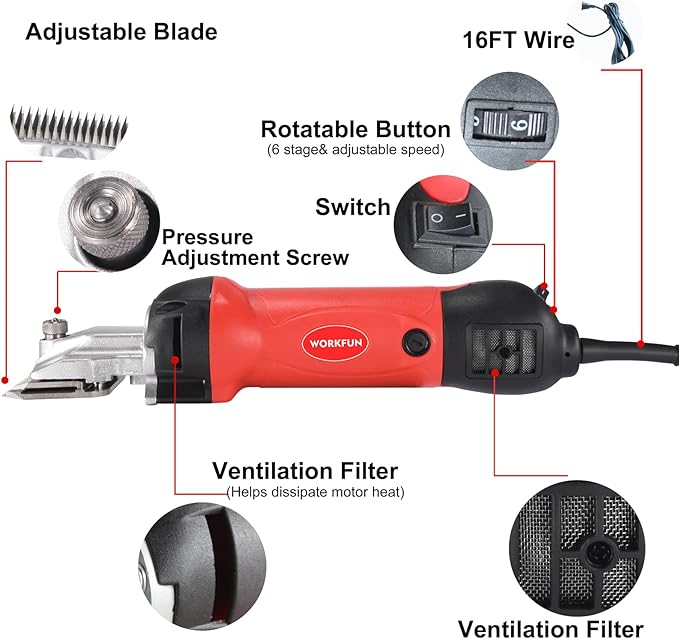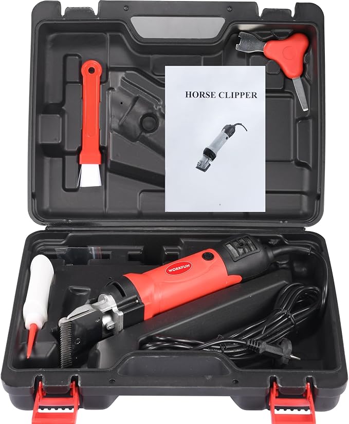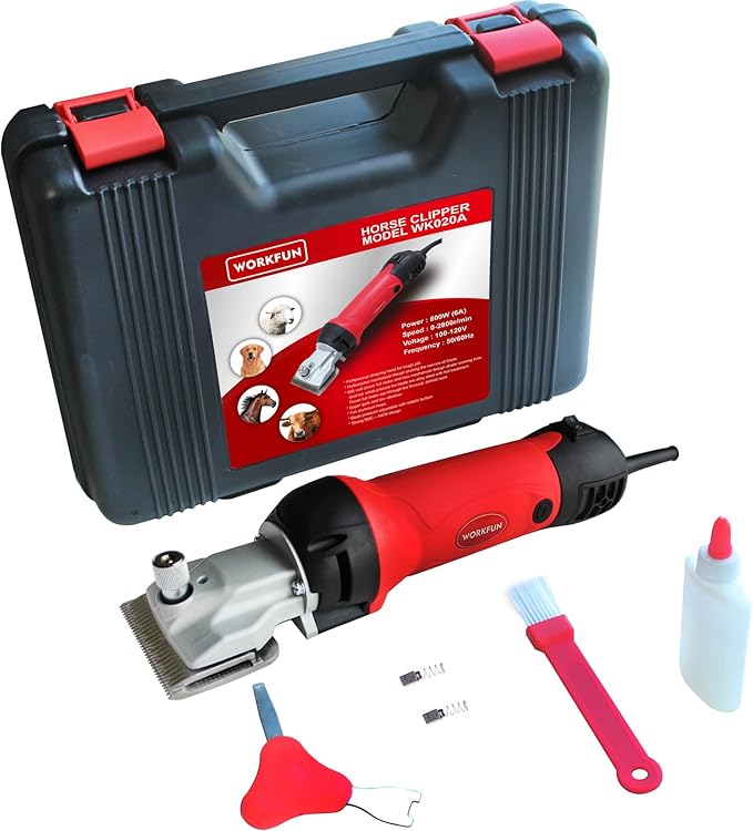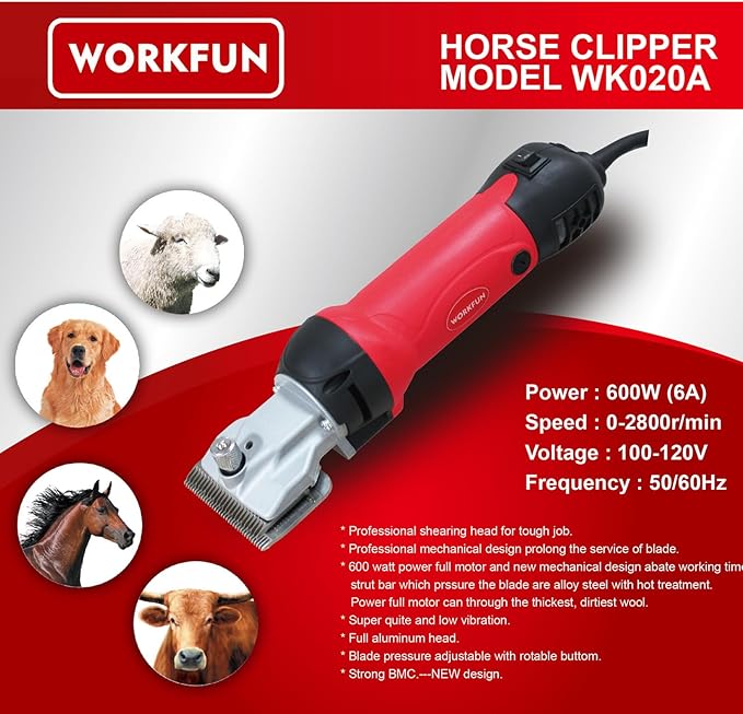 - PROFESSIONAL HORSE SHEARS:WORKFUN Powerful 600w horse clippers designed for professional grooming. Strut bars that pressure the blade are alloy steel with hot treatment. Variable 6-speed control up to 2800 r/min with comfortable grip protection, making precision scissors suitable for daily cutting. These horse shears are suitable for trimming horses, Cattle, alpacas, sheep, and llamas.Not suitable for pet dogs!