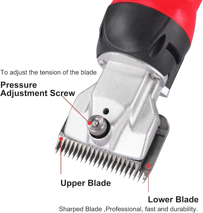 - HIGH QUALITY:This professional electric horse clipper has a blade with high hardness and high heat resistance. Blade pressure is adjustable with the Pressure Adjustment Screw for easy and quick shearing. Strut bars that pressure the blade are alloy steel with hot treatment. Full aluminum head.super quiet and low vibration.