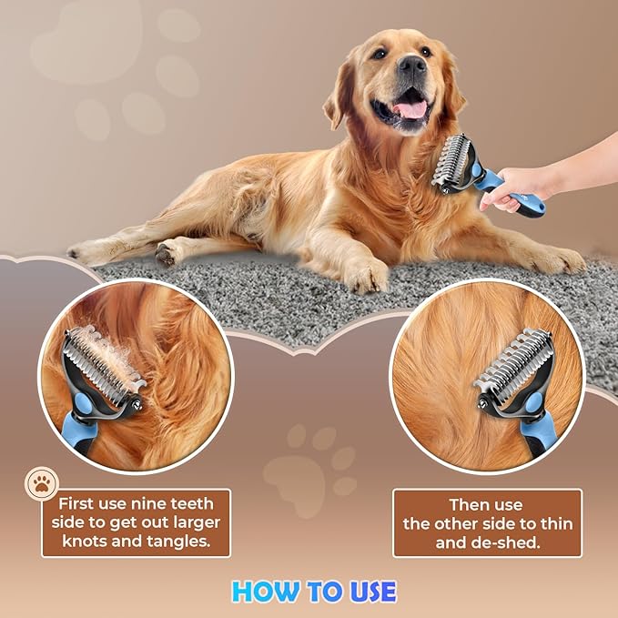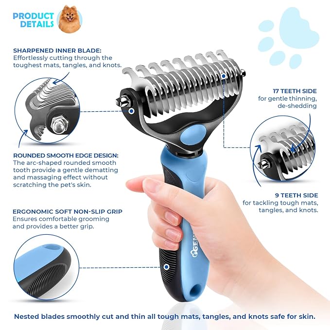- Dual-Sided Design: Start with the 9-teeth side for effortless removal of stubborn mats, tangles, and knots, then switch to the 17-teeth side for effective deshedding and thinning. Ideal grooming rake for medium to long-haired, double-coated pets.