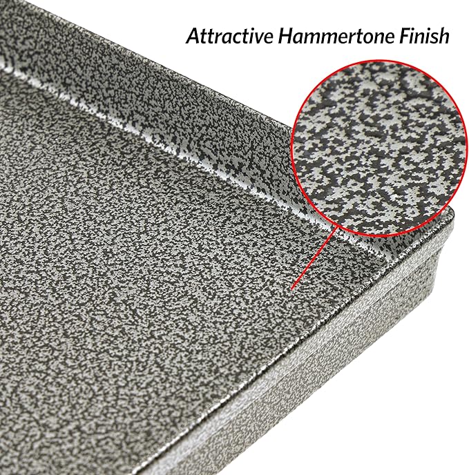 - Leak proof metal replacement pan made of a leak proof welded seam and rust resistant powder coat finish with heavy duty durable metal construction