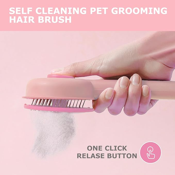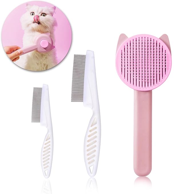 Pet Grooming Brush Kit for Cat and Dog, Hair Massage Cleaner with Release Button, 2 Flea Combs for Shedding Removing Tangles Loose Fur Self Cleaning Accessories, Pink (3 Pieces Set)