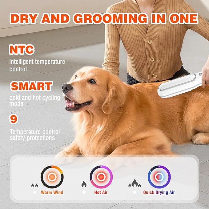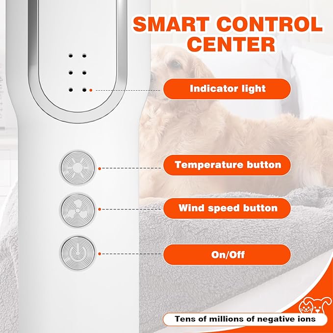 - 【3 Heating & 3 Fan Speeds 】 The dryer temperature and speed is adjustable, The temperature can be adjusted in three gears Temperature range 35-75℃, Three-speed adjustable wind speed, Choose the comfortable heat for your pet. Besides, 360-degree runway circulation wind & the latest NTC Smart Temperature adjustment function can keep the temperature of 38.9℃ ,which is friendly for our pet baby.