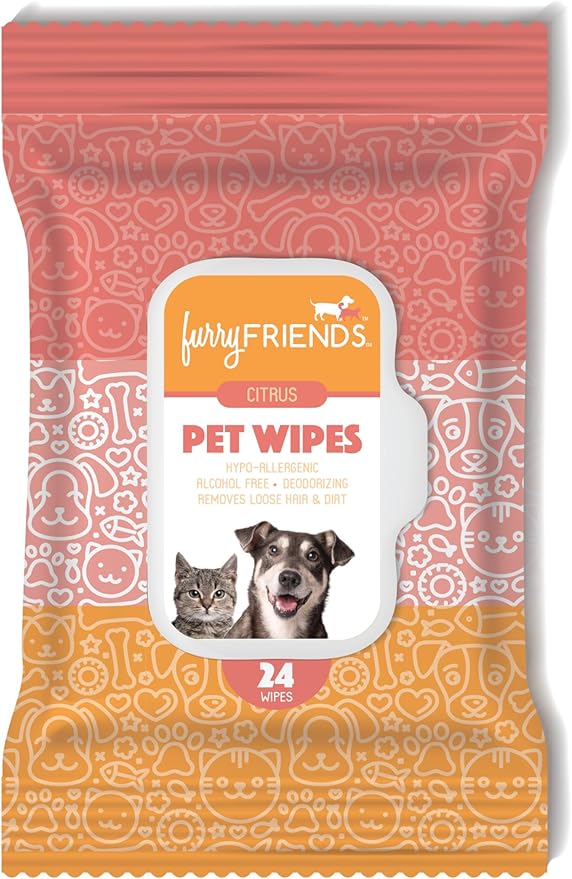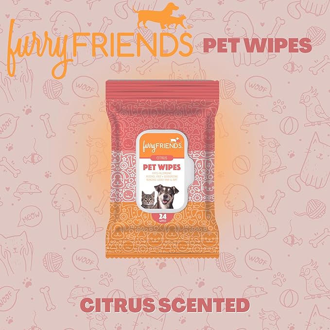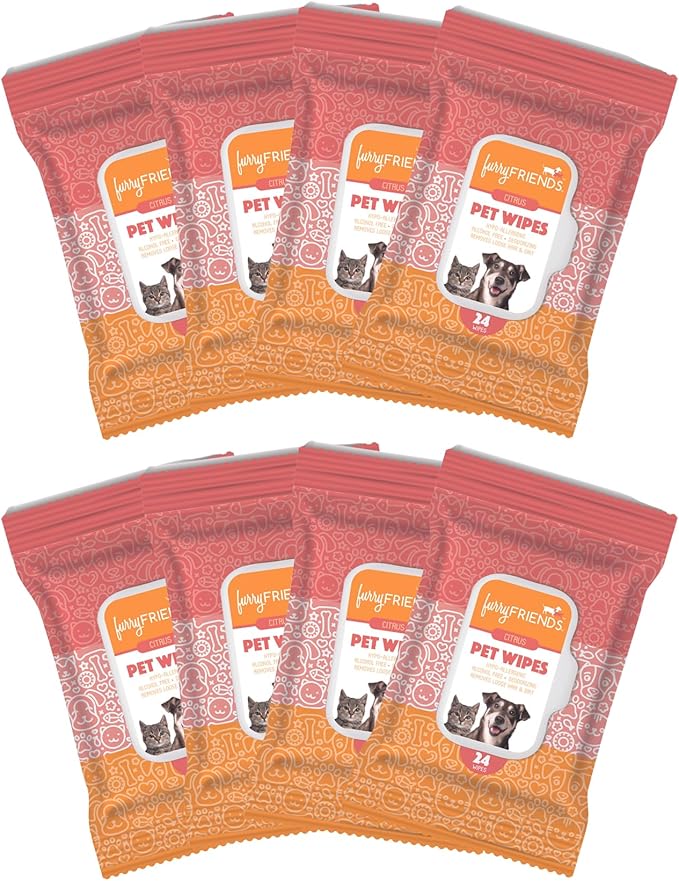 FurryFriends Pet Wipes | Citrus Scented | Hypo-allergenic | Alcohol Free| Deodorizing | Removes Loose Hair & Dirt | Incredibly Clean | 8 Pack