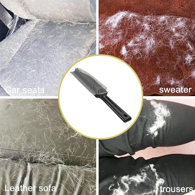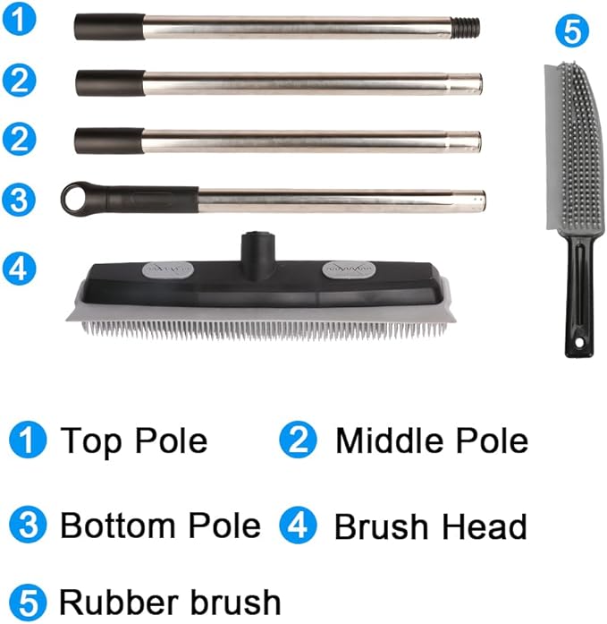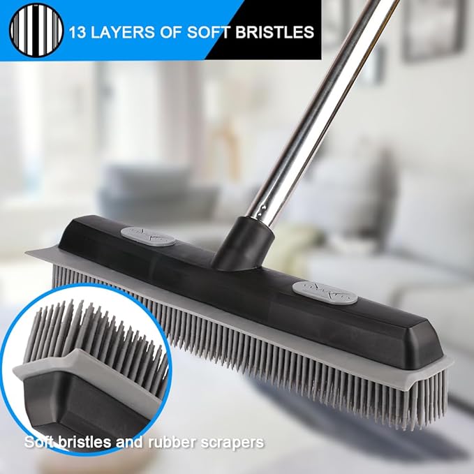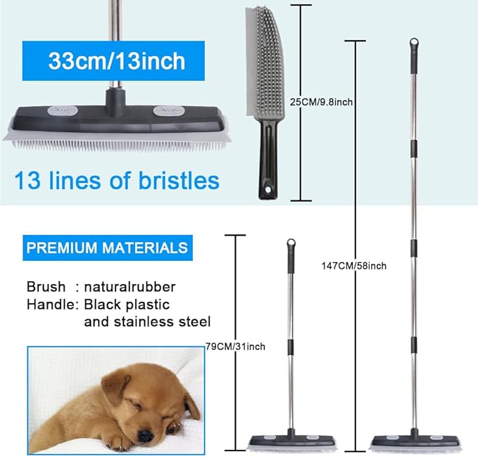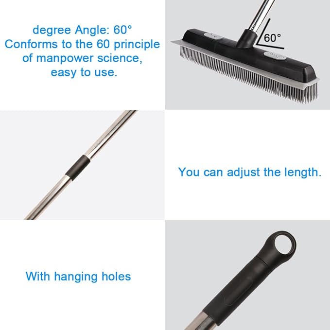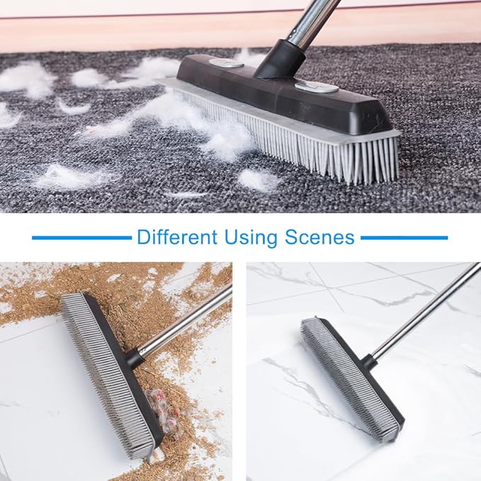 Pet Hair Rubber Broom with Carpet Rake and Pet Brush, 2 in 1 Floor Brush for Carpet, 62 inch Adjustable Handle