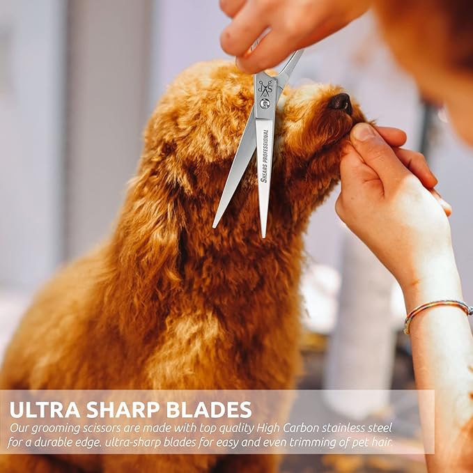 - 🏆 Premium Quality: Our professional grooming scissors are made from high-quality stainless steel and are perfect dog accessory for dog groomer to have in his dog grooming kit in his professional scissor set.With its ultra sharp haircut scissors edge it provides perfect haircut styles with everlasting grooming and professional scissors to cut hair,pet grooming.Our small scissors provide extra sharp trimming of eyebrows,nose hair and beard.