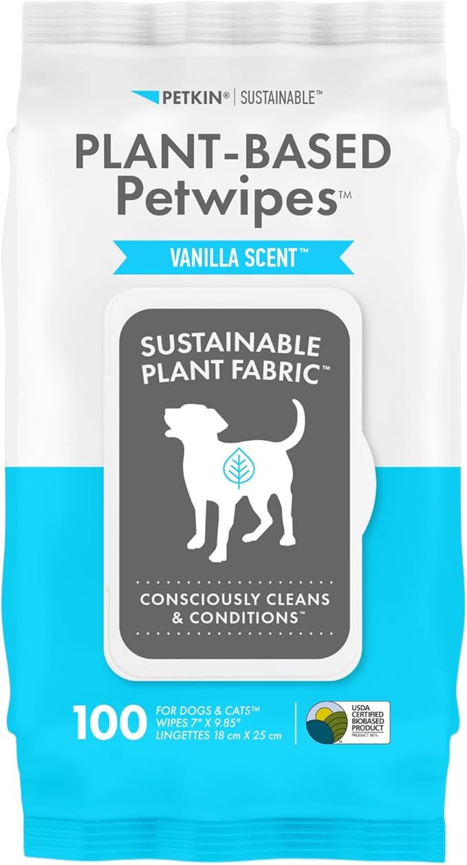 - Petkin Plant-Based Wipes For Dogs and Cats - These wipes are made with a thick and strong, USDA Certified Biobased fabric - NO synthetic materials used. So you can care for your pet while caring for the planet. Includes 1 pack of 100 wipes.