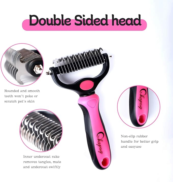 - DESIGN OF DOG DECOATING TOOL】: High quality stainless steel metal teeth and compact design make our product sturdy and durable. High quality and lightweight TPR handle provides a comfortable non-slip grip and allows you to enjoy grooming your dog's hair. Double coated high quality combing shedding dog comb, dog rake, cat brush, matte coat comb for dogs.