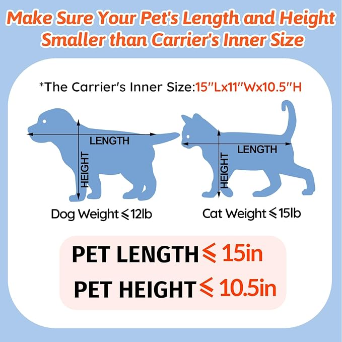 - 【CHECK SIZE BEFORE BUYING】In order to fit the under-seat dimensions of airlines, this carrier can only fit small dogs and cats. We recommend that the pet size you carry be within 15"L x 11"W x 10.5"H and the DOG max weight is 12LB, CAT max weight is 15LB. Please don't choose the carrier only based on weight but also reference your pet's length and height.