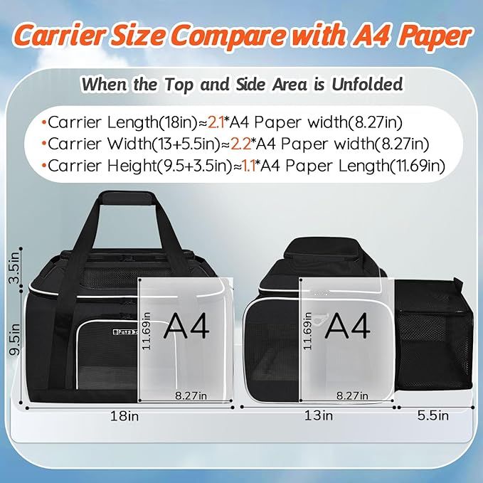 - 【AIRLINE APPROVED CARRIER 】Unfolded size:18"L×(13+5.5)"W×(9.5+3.5)"H, Petskd pet carrier is TSA approved and can be placed under the seat in the cabin, it is mainly designed for ①Southwest Airlines:18.5x13.5x9.5"②Allegiant Airlines:19x16x9", but also in compliance with ③Air Canada:21.5x15.5x10.5". We recommend you buy this carrier when you fly with the above-mentioned airlines. When you take the carrier on airplane, please fold the top and side expansion areas for the size of airline se