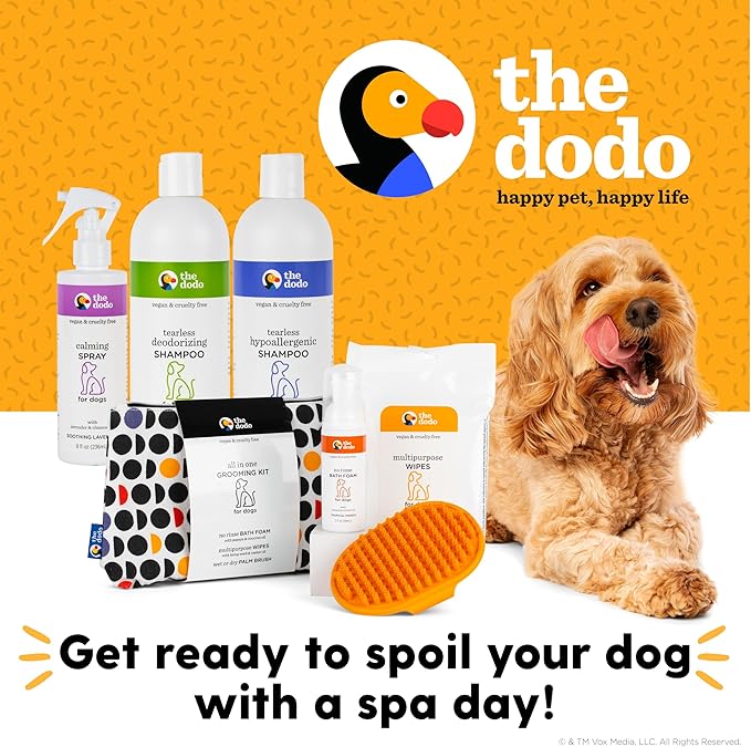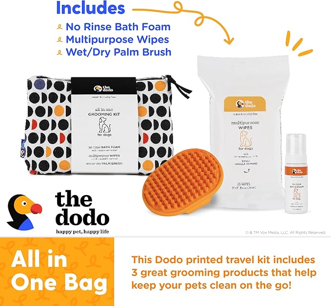 The Dodo All-in-One Dog Grooming Kit, Includes No Rinse Bath Foam, Wipes, and Wet/Dry Brush; Vegan, Cruelty-Free and Contains no DEA, MEA, SLS or Parabens