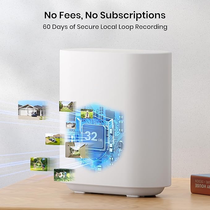 - No Monthly Fee with Homebase: All recordings will be encrypted and stored in home base without subscription or hidden cost. 32GB of local storage provides up to 2 months of video loop recording. Even if the cameras are damaged or lost, the data remains safe. Homebase also provides instant notifications and stable live streaming.