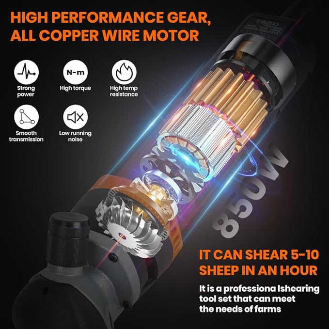 - 850W HIGH POWER: 850W high power motor made of high temperature resistant all copper wire set with 2400RPM speed, featuring ultra-low power consumption, ultra-high temperature resistance, powerful output and long machine life. It is a professional shearing tool set that can meet the needs of farms. It can shear 5-10 sheep in an hour, and can restore long wool for goats, sheep, alpacas, llamas, alpacas, large dogs, Angora rabbits and other animals to restore long wool.