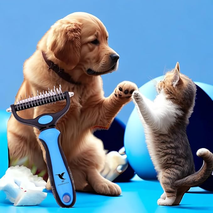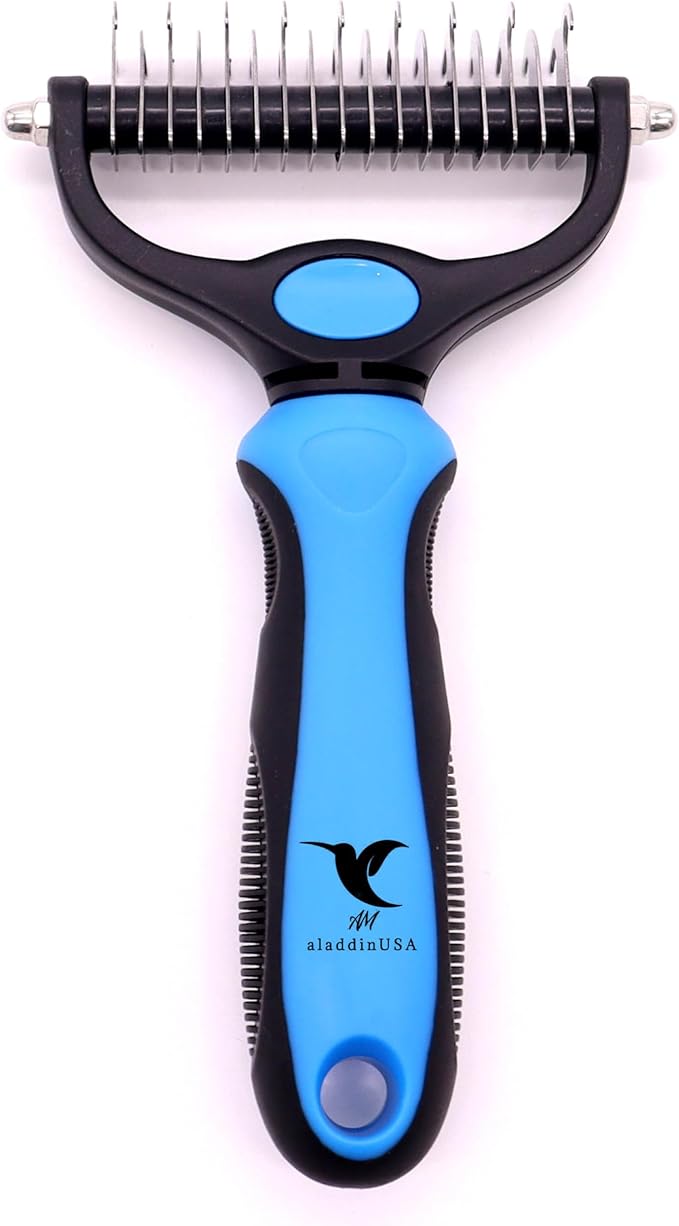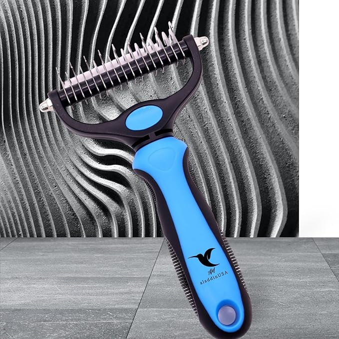 - EXCLUDE TANGLES AND KNOTS: This two-sided brush. One side 9 – teeth and other side with 17- teeth cat and dog undercoat rake for shedding exclude matted fur, tangles, and knots! It’s both sides of our comb for Dogs and Cats thin get rid of loose fur, flakes, and dirt.