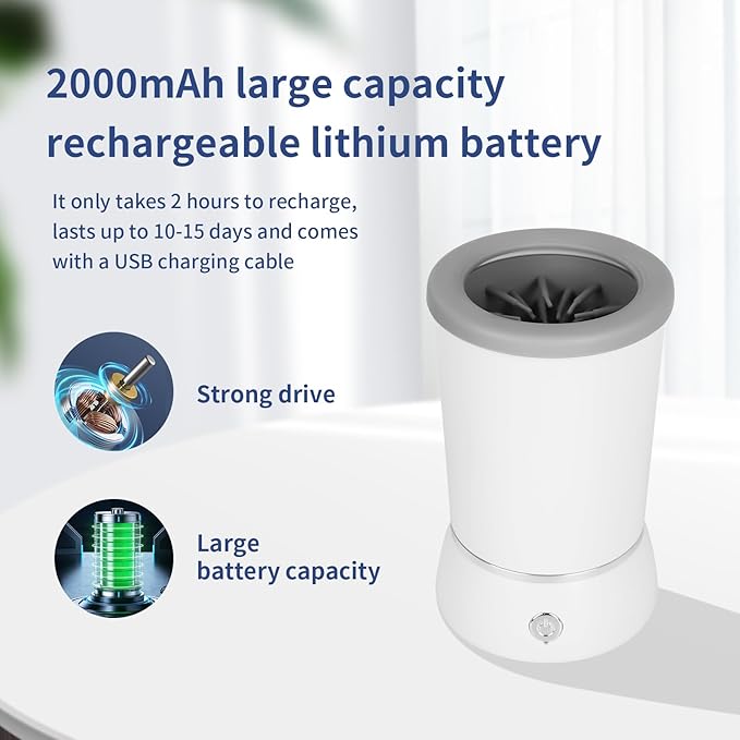 - [Easy to clean and durable] automatic paw washer, easy to disassemble and clean. Just remove the top cover, remove the silicone brush pad, and wash with water. Built-in 2000mAh large-capacity rechargeable lithium battery, full charge only takes 2 hours, battery life up to 7-10 days, and is equipped with type-c charging cable