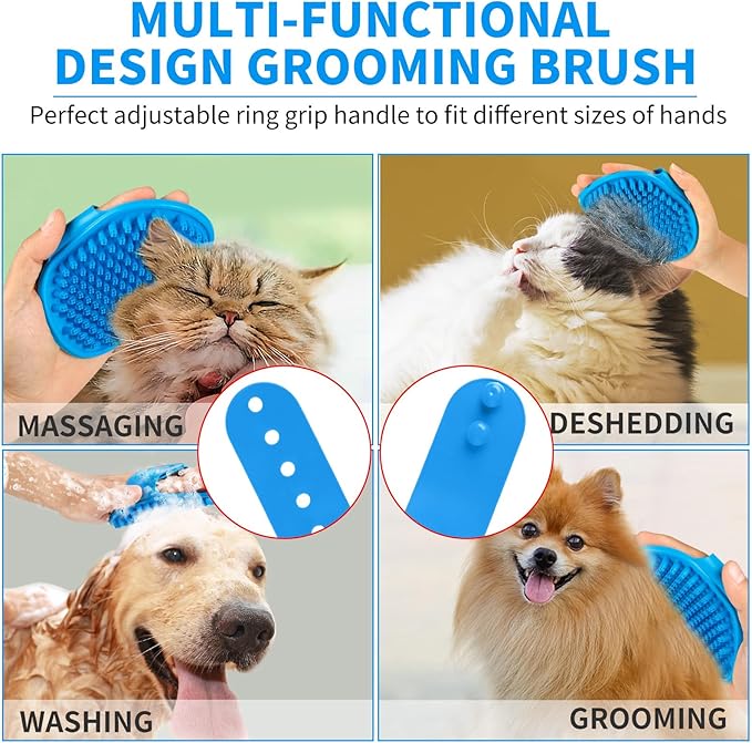 - 🐾【2 PCS Adjustable Dog Wash Brush】This dog scrubber for bath is ergonomically designed with a perfect adjustable ring handle, which can adapt to different sizes of hands, easy to hold. 2 dog bath brush scrubbers are used together, it can effectively remove pet hair while bathing or massaging, giving your pet an excellent bathing experience.