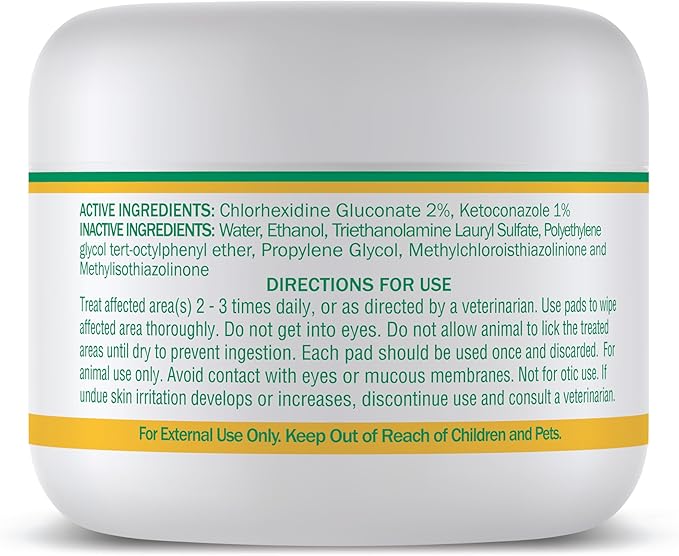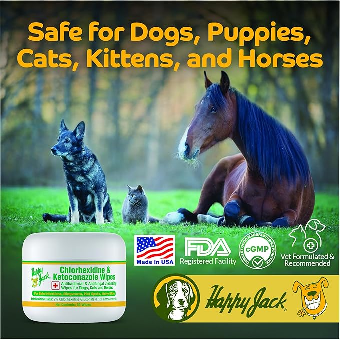 - SOOTHING DOG WIPES FOR DOGS, CATS, HORSES. Premoistened with 2% Chlorhexidine solution for dogs and 1% Ketoconazole for dogs to fight skin conditions including yeast. Used as pet wipes for dogs, dog face wipes, dog cleaning wipes, and wrinkle wipes.
