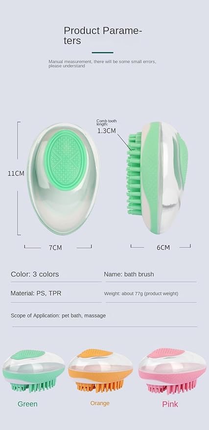 - 5.LIGHTWEIGHT AND COMPACT: Weighing only 0.077kg, this pet bath/massage brush is very lightweight and easy to handle. Its compact size (4.3307087 * 2.7559055 * 2.362204) inches, easy to carry and store.