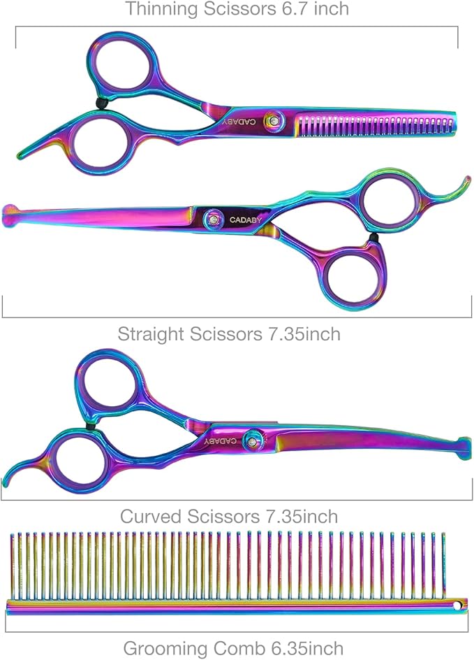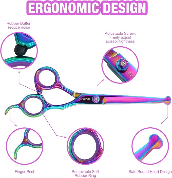 - Ergonomic Design for Use Easily: CADABY dog scissors for grooming are comfortable to hold by right hand. A rubber bumper at the handle which can reduce noise during trimming and keep your pet won't frightened. Our dog scissors equipped a adjust screw,you can adjust the tightness of the scissors according to your personal feeling. Very convenient