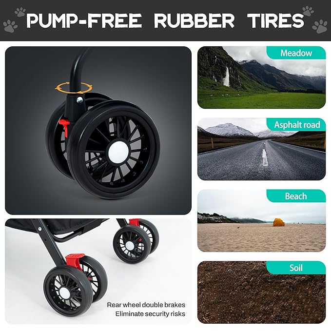 - 【Sturdy wheels】The wheels are sturdy,durable,and not easily worn, and can be used in most places.The wheels have shock absorption function,and for rough roads,the springs on the wheels can reduce vibration, which can alleviate the discomfort of pets.The universal wheels of the wheels can easily change the direction of the stroller's movement.The rear wheels of the wheels have a braking function to prevent accidental sliding of the stroller