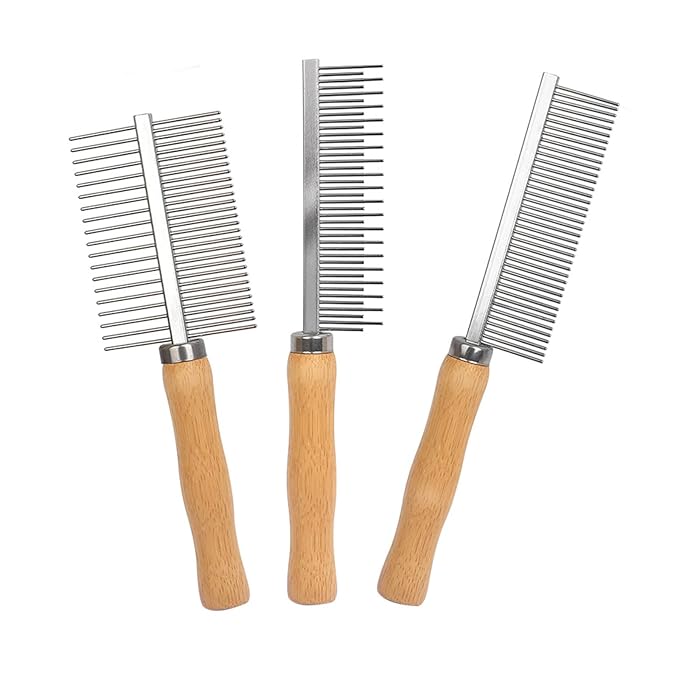 - These dog combs have two different densities of wire teeth. Wide teeth can be used for combing knotted fur, while close teeth are ideal for brushing soft hair around the eyes, ears and fine hair on the legs. Please comb the fur lightly.