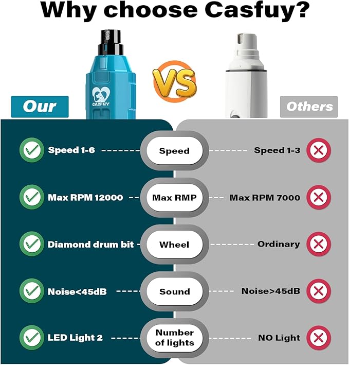 - Newest enhanced power & 6 precisely controlled speeds: 7000RPM to 12000 RPM power makes Casfuy dog nail grinder one of the most powerful grinders on the market. It is also the safe power to grind at home. Multiple speeds and ample power meet small, medium, and large pets' nail trimming needs.