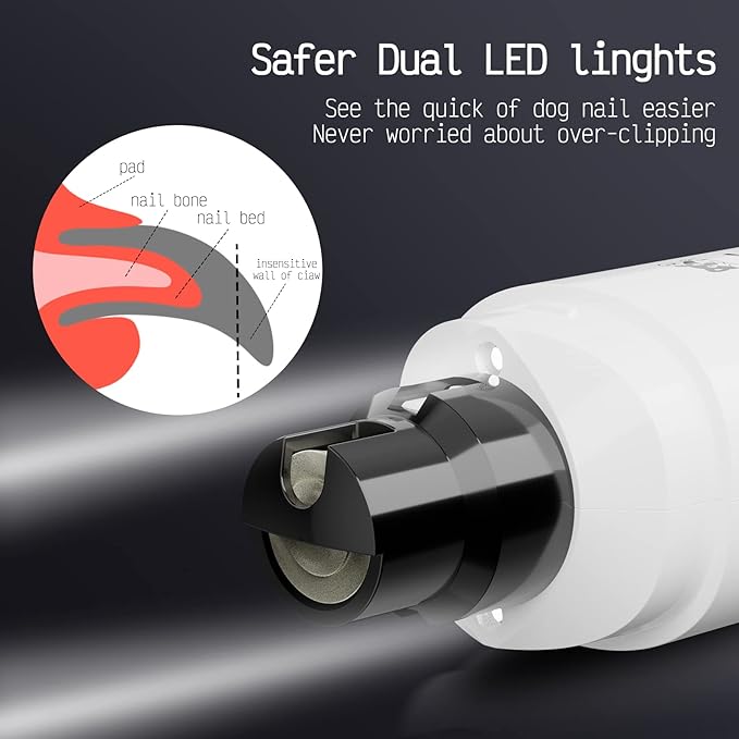 K&K Dog Nail Grinder with 2 LED Light for Large Medium Small Dogs Professional 2-Speed Powerful Electric pet Nail Clipper which Gentle and Painless Paws Grooming & Smoothing Tool (White)