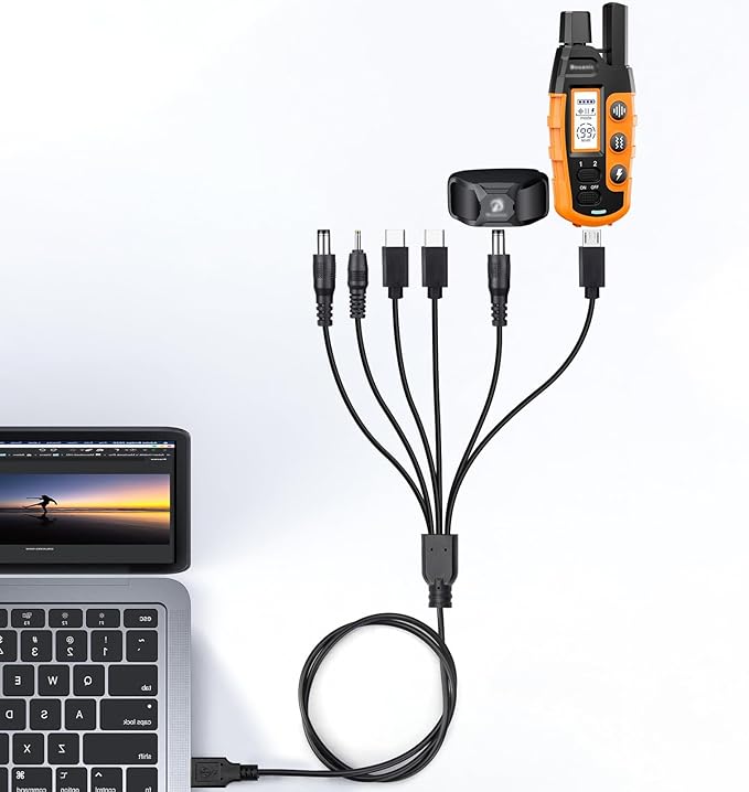 - 6 in 1 charging cable, 1 micro charging port, 2 USB-C charging ports, 3 DC charging ports; Charge your shock collar's receiver and remote at the same time