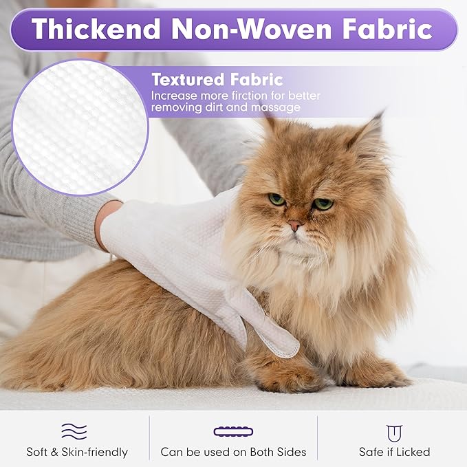 - Thickened Dog Wipes - High-quality, thick and soft non-woven fabrics are not easily broken during use. Textured fabrics increase friction, better remove dirt and massage, gloves are designed for more flexibility and convenience, and it can be used on both sides, providing soft grooming for your pet.