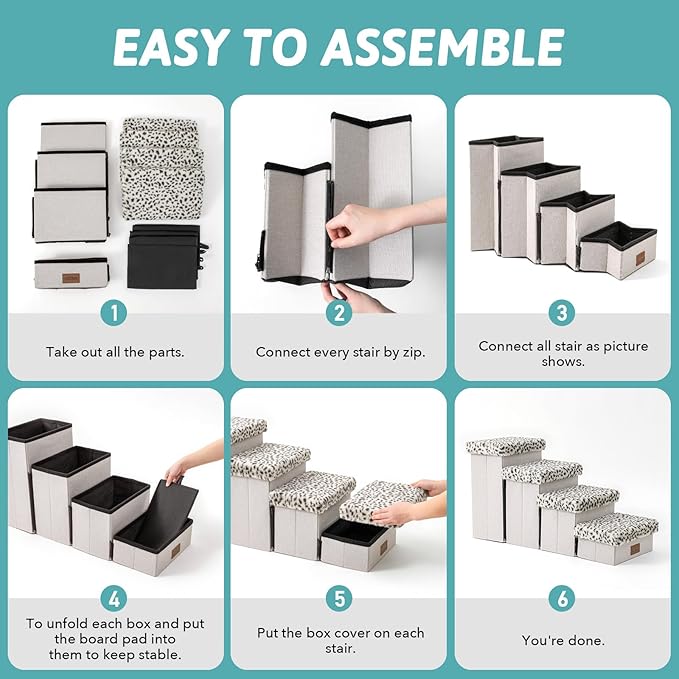 - 【Easy to Assemble】First you need to connect the zipper of each step, then open each step completely, Place each support board in the corresponding storage box, and finally cover it. When you don't need it, remove the cover and store it after it is completely folded. This saves your space and is suitable for small rooms. You can also watch our installation video in the product description below.