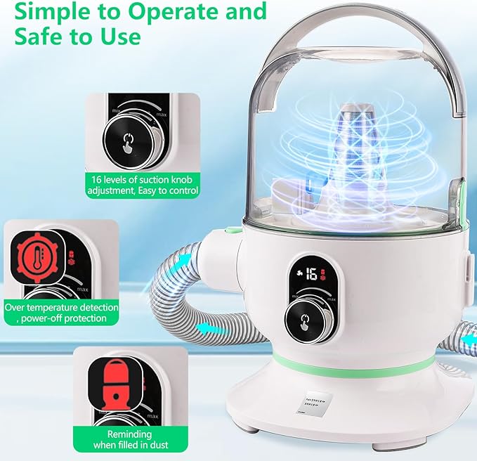 - Easy to Use: Pet grooming vacuum with a 2L large-capacity dust cup and one-touch lid-opening operation makes collecting and dumping pet hair simple; 16 grades for pets at different stages of growth and different use
