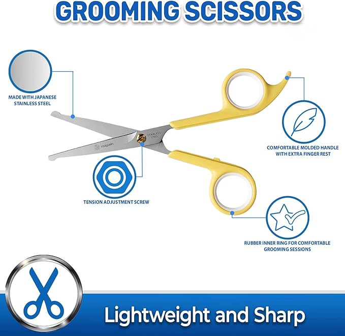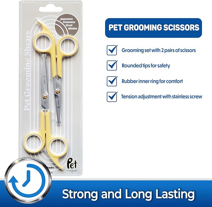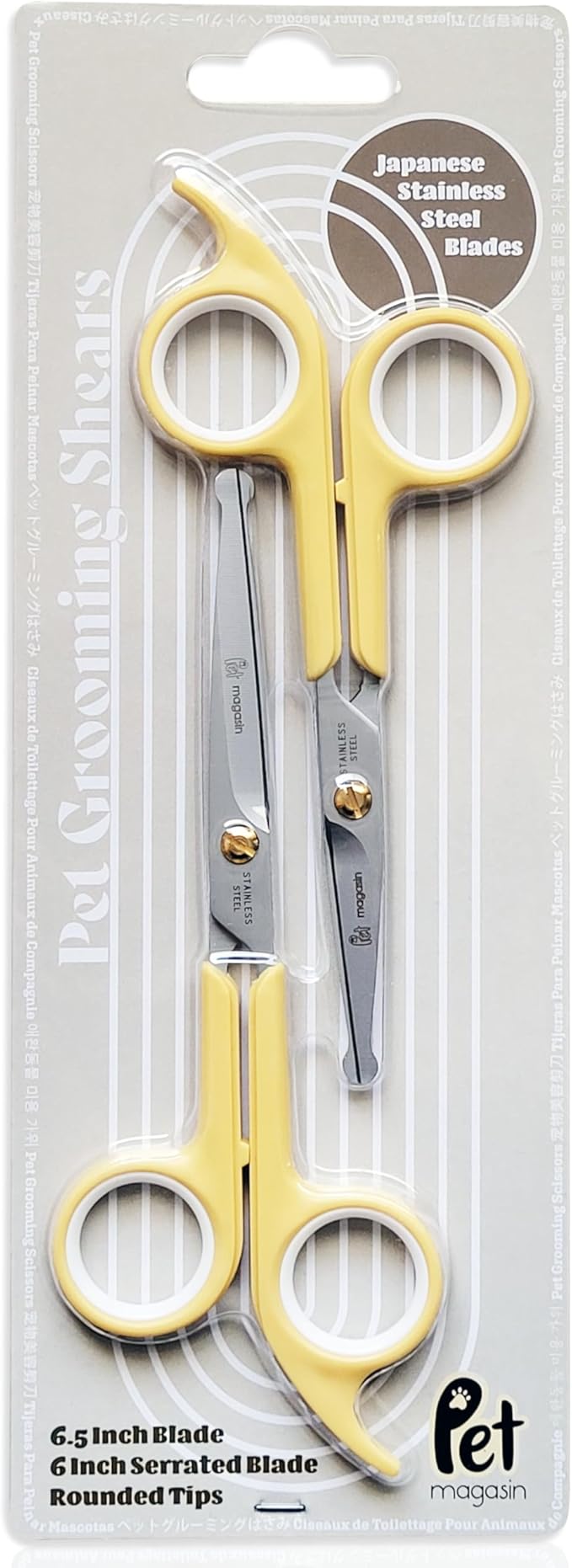 Pet Magasin Japanese Stainless Steel Grooming Scissors (2) for Facial Hair and Larger for Body Trimming with Round Tip (Yellow)