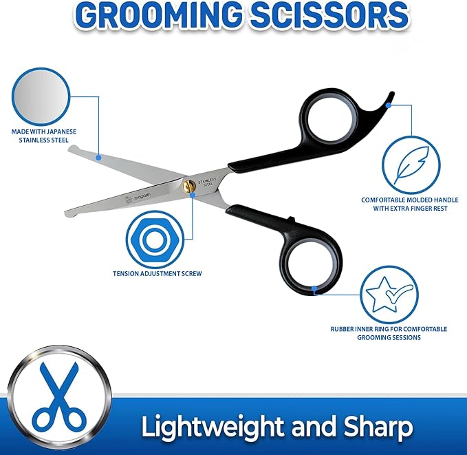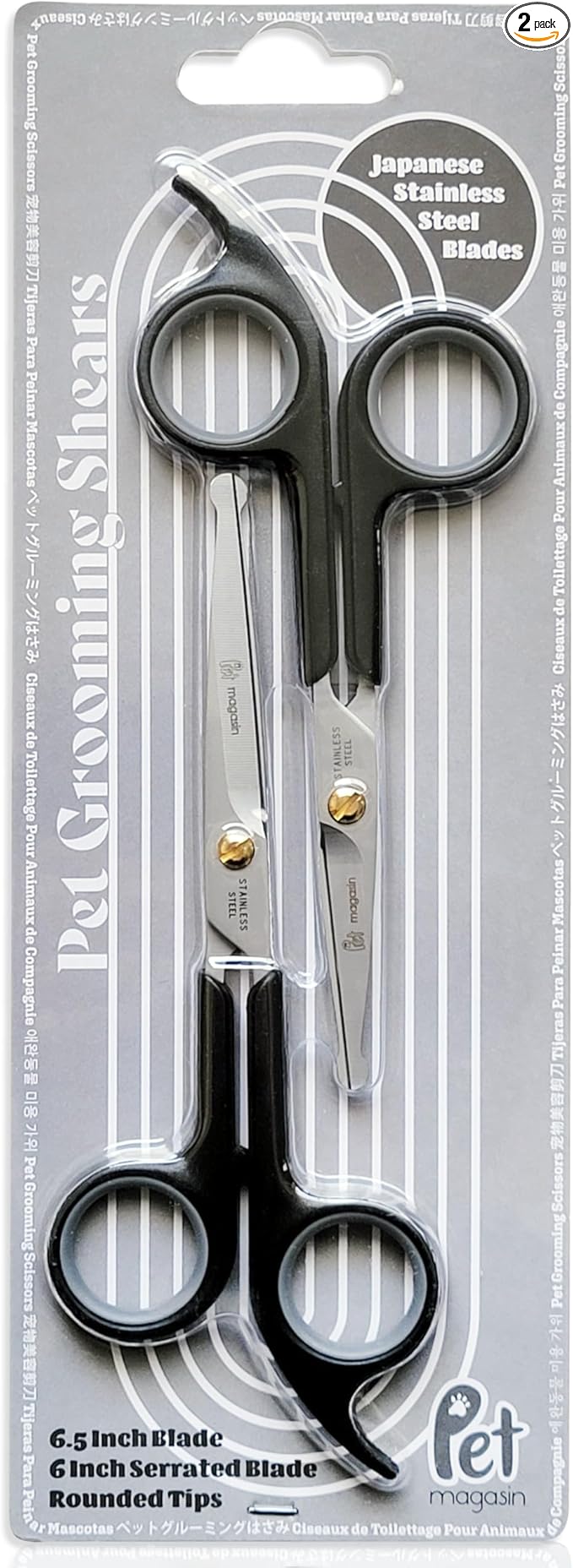 - A complete pet-grooming set with 2 pairs of scissors: a longer pair with smooth blades for trimming body fur, and a smaller pair with micro-serrated blades for close work on your pet's face and paws