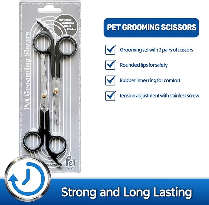 Pet Magasin Japanese Stainless Steel Grooming Scissors (2) for Facial Hair and Larger for Body Trimming with Round Tip (Black)