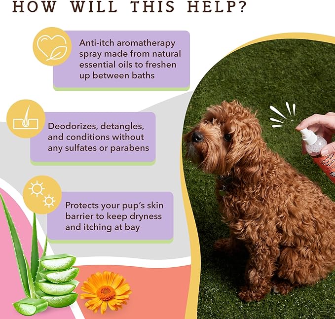 - TARGETED CARE FOR ITCHY SKIN: Specifically crafted for dogs with itchy skin, our spritz deodorizes your pet's coat with a clean, floral scent from essential oils. Its skin-soothing ingredients tackle itchiness and irritation, enhancing your pet's comfort and making their coat ready for cuddles.