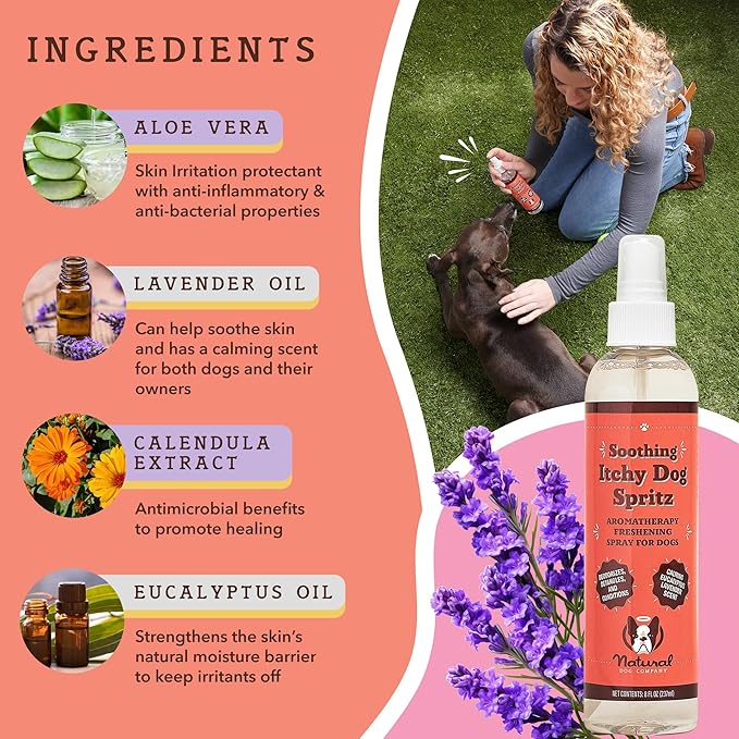 - NATURAL & SAFE INGREDIENTS: Packed with key ingredients like Aloe Vera, Lavender Oil, Calendula Extract, Eucalyptus Oil, our spritz is a trove of nature's best for your dog's skin. This dog grooming spray soothes skin irritation, hydrates dry skin, and conditions fur, promoting overall wellness.