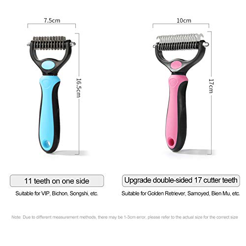 - BEST PET BRUSH FOR MEDIUM TO LONG HAIRED DOGS & CATS - 9 rounded teeth on one side for easy removal of mats and tangles (USE SHORT STROKES) / 17 rounded teeth on other side perfect for deshedding and thinning hair. Great deshedding & dematting comb for long haired cats and dogs.