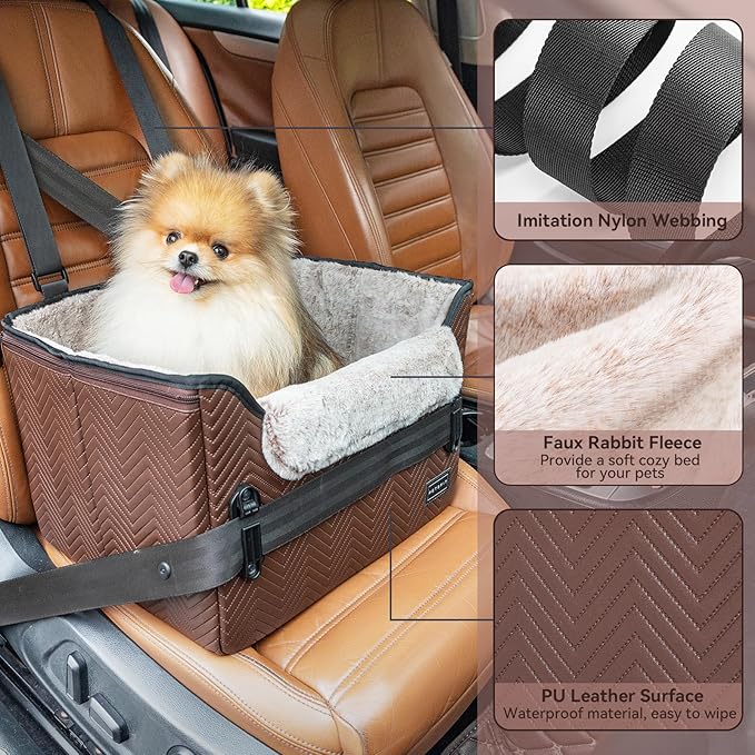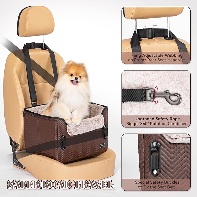 PETSFIT Car Seat for Dogs, Waterproof PU Leather Dog Car Seat for Small Dogs with Patented Safe Buckles, Clip-On Leash, Pet Travel Carrier Bed for Small Pets Up to 25lbs (Brown)