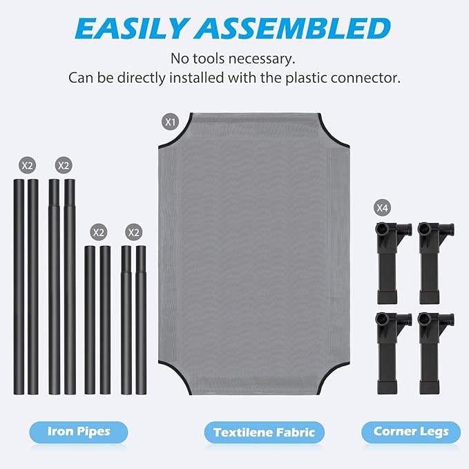- Easy to Install: The cooling dog cot can be installed without the use of any tools, screws and can be installed directly with the plastic connector. It only takes a few minutes of your time, and presto! It's up and ready for your pet to enjoy in.
