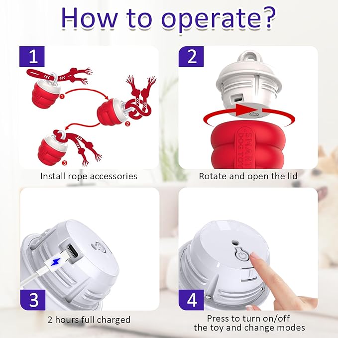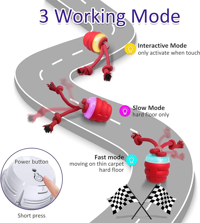 - How to use? Screw out the outer case to see the power button. Press first, power on and dog ball rolls in fast mode(blue light), change working mode by short press. Slow mode(purple light),Interactive mode(yellow light).Add the stronger rope on help balls rolls well, or you could DIY others special tails